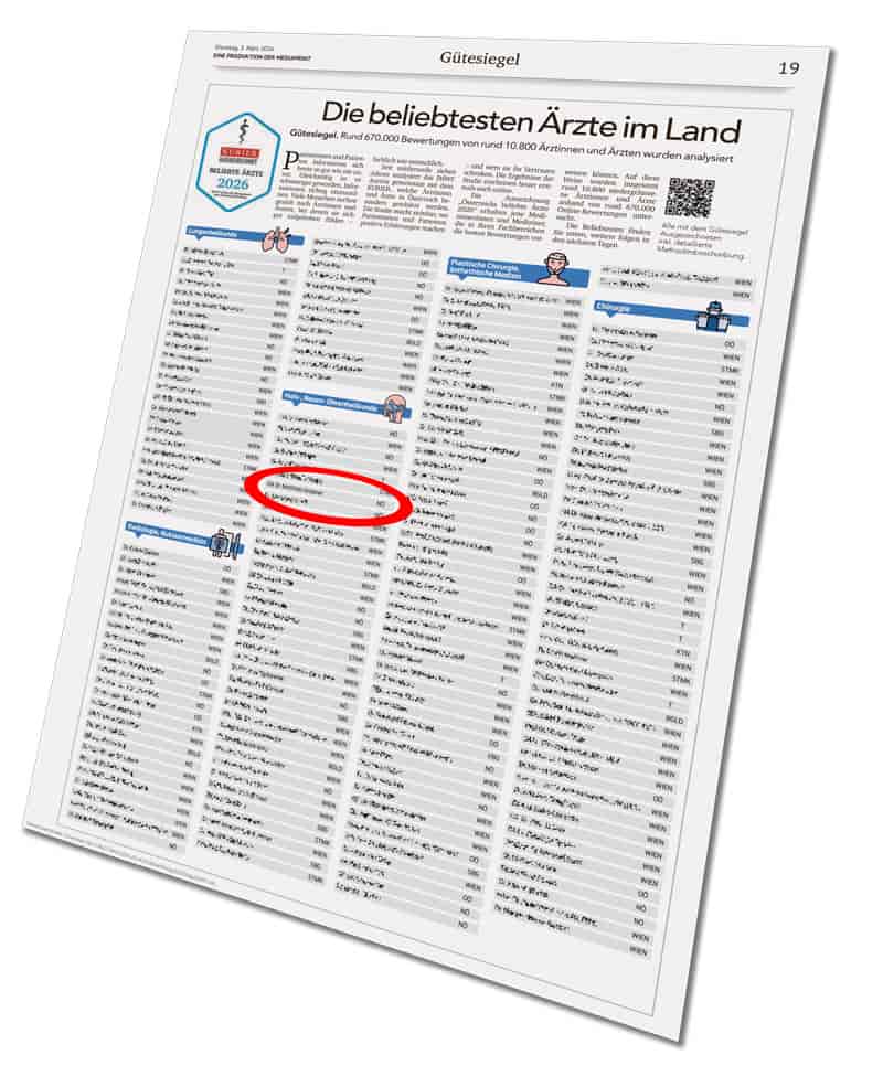 Seit mittlerweile sieben Jahren analysiert das IMWF Austria gemeinsam mit dem KURIER, welche Medizinerinnen und Mediziner in Österreich besonders geschätzt werden. Die Studie zeigt, wo Patientinnen und Patienten positive Erfahrungen machen – und welchen Ärztinnen und Ärzten sie ihr Vertrauen schenken. In diesem Jahr werden die Ergebnisse erstmals auch online veröffentlicht. Die Auszeichnung „Österreichs beliebte Ärzte 2026“ erhalten jene Medizinerinnen und Mediziner, die in ihren jeweiligen Fachgebieten die besten Bewertungen erzielen konnten.